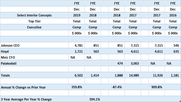 From Company Proxy Statement and S-1 filings with the SEC, below are Select Interior Concepts' Top-Tier Executives Annual Total Compensation for each of two consecutive full years of employment for the three most recent years ..... all during the Trump-Pence Administration and a Republican-Controlled US Senate.